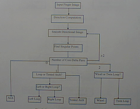 Given the database for the fingerprints is very large, the matching should be done only on a subset of the database. To this end, the fingerprints are classified in to five main categories as a high-level features that can be used in reducing the search source during a match. They are : arch, tented arch, left loop, right loop, and whorl.