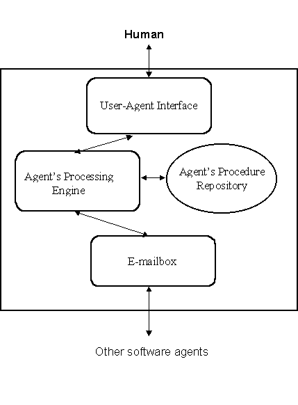 A generic architecture of the software agent, adapted from Poggi [6] is depicted in Figure 1. For the telemedicine context, and as described later in more details, the user (e.g., patient, nurse, physician) interact with their agents via the User-Agent Interface. The interface role is to pass the agents data in the users format. The agent uses its embedded procedures (Agents processing engine) and its data (Agents Repository) to perform tasks and exchange information via the electronic mailbox. Agents are seamlessly connected together both horizontally and vertically.