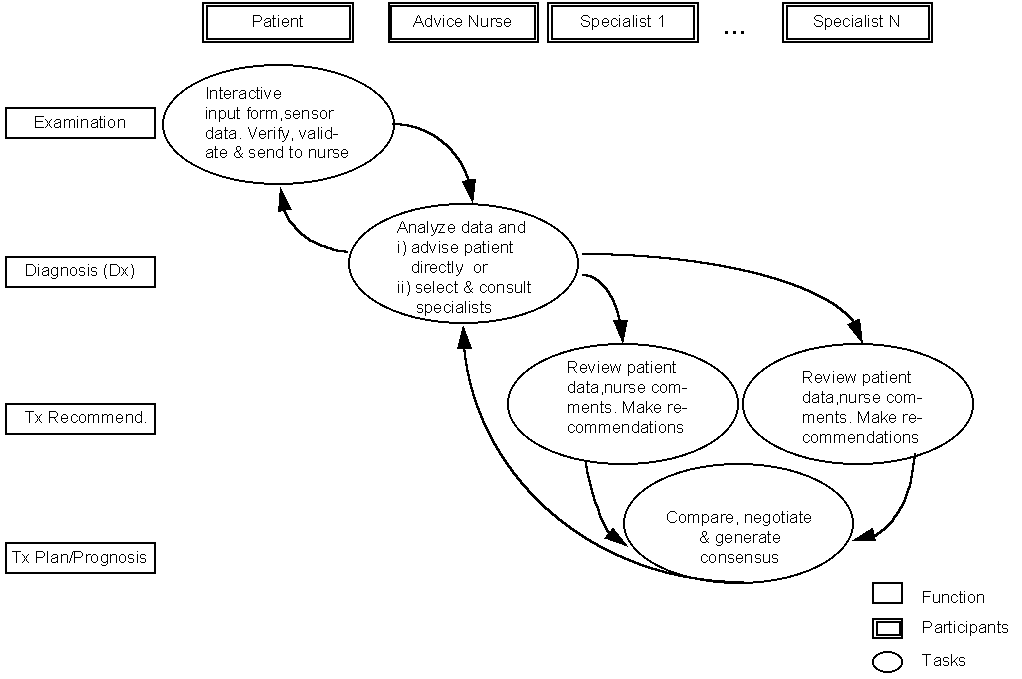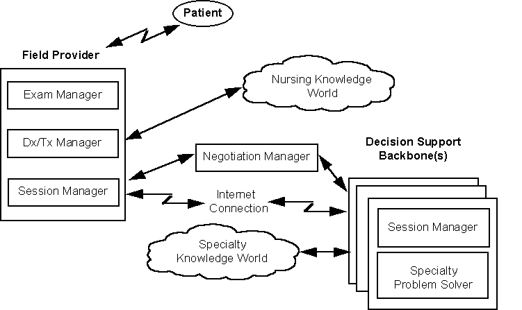 A treatment scenario begins with data about the problem being gathered by the Exam Manager at the patient site. It is passed on to the Dx/Tx Manager at the site where the field provider/advice nurse is located. The Dx/Tx Manager analyzes the patient data received over the Internet and, using a knowledge and cost-based approach, identifies which Specialty Problem Solvers should participate in generating treatment recommendations. The Session Manager at the field provider site then initiates communications with their counterparts belonging to these Specialty Problem Solvers. The Solvers execute the problem, independently or interactively with a human specialist, and arrive at recommendations. The Negotiation Manager receives their recommendations and applies its own algorithms to reach an overall consensus solution. The solution is then communicated back to the Dx/Tx Manager which is then presented to the field provider through a human interface.