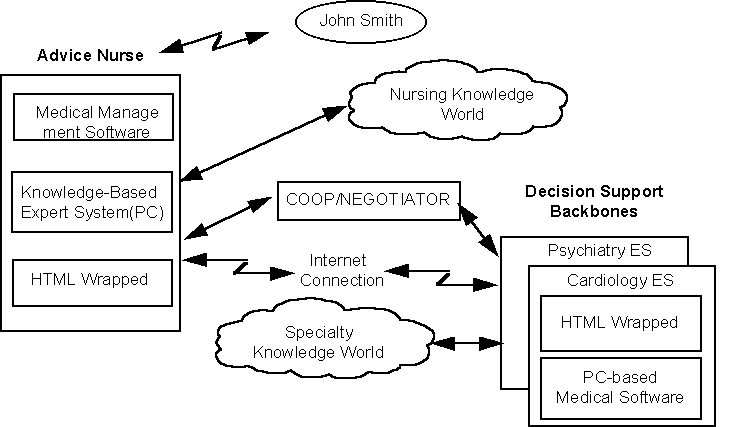 On a warm summer evening in July, John Smith, a successful executive at the ABC Inc., returned from his week-long negotiating sessions with his overseas customers. The negotiations were tiring and long, and John felt both physically and mentally exhausted. He had not been able to convince his customers to renew the contract. This was when he began to experience severe abdominal pain and dizziness. Immediately, John turned on his laptop computer, attached himself to the vital signs devices to the PCMIA slot of the laptop, punched in the URL to hook up to his Field Nursing Station (FNS) - a World-Wide-Web interactive nursing station assigned to him whenever he is on travel. The computer at the nursing station immediately beeped to alert the advice nurse about Johns connecting to the health information network and displayed the incoming vital signs data. The computer loaded Johns medical file, validated and verified his incoming biodata, and detected that he is dehydrated and suffered from shortness of breath. The FNS also found John to have typical symptoms of depression and so advised the nurse. The FNS computer also analyzed Johns biodata and concluded that advice must be secured from a cardiologist and psychiatrist as well. It asked for permission from the nurse to contact these remote specialists immediately. The nurse reevaluated the data and concurred with the computer. Upon the permission from the nurse, the nursing station computer connected to these specialists at the remote sites. The computers at the specialists sites examined the data and interacted with the physicians, and at one instance, acted as an educated facilitator/negotiator for the cardiologist and psychiatrist as their two initial treatment plans were different. Once, consensus on a treatment plan was reached, the computer relayed the negotiated recommendations to the nurse. These recommendations included advising John to take Ecocyn1 tablets, plenty of fluids, and rest and log back to the nursing station in two hours. The nurse once again reviewed the recommendations and approved them. The computer initiated a teleconferencing session between the advising nurse and John, and the nurse communicated the ordered prescription to him personally. She also informed John that arrangements have been made for him to pick-up the medication at the nearest pharmacy. The entire operation last approximately 25 minutes.