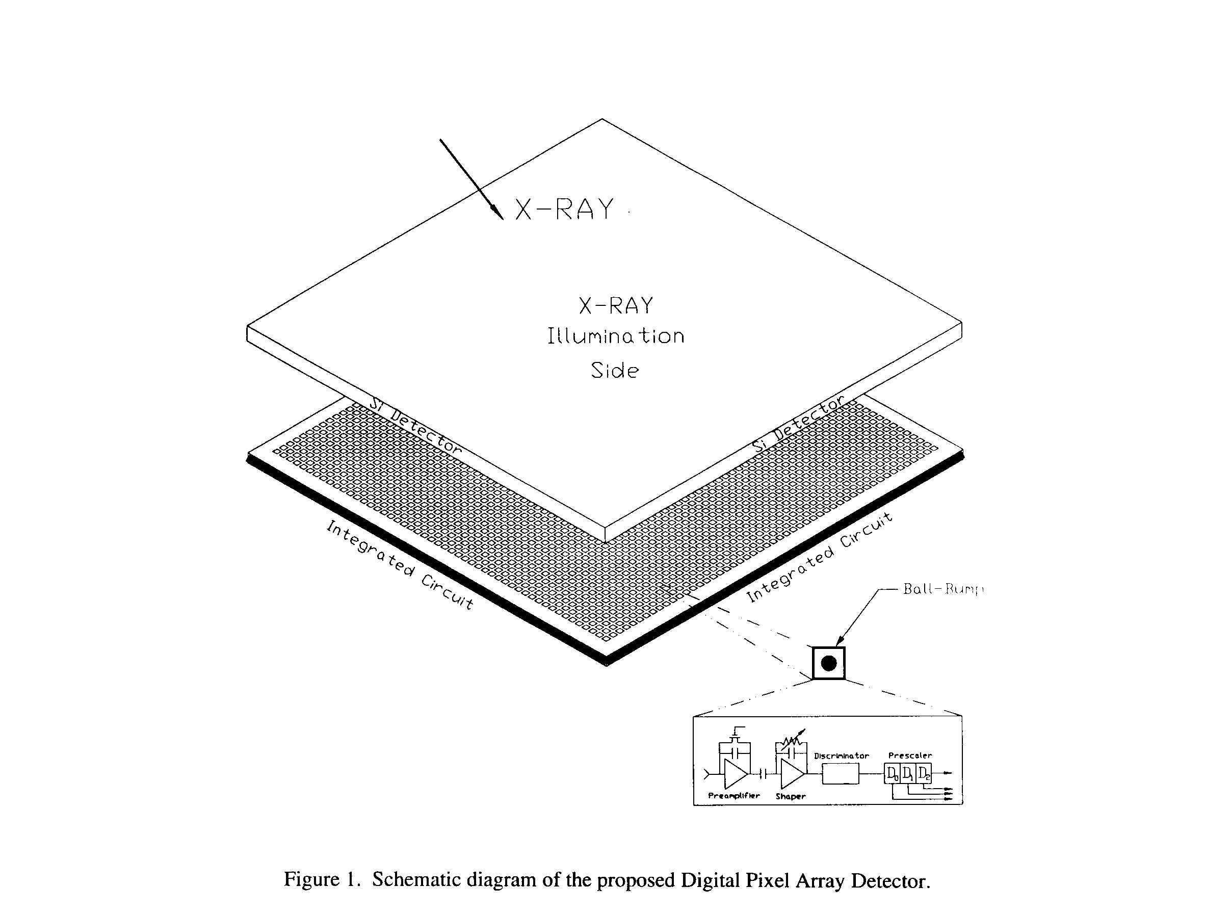 The Digital Pixel Array Detector (DPAD) presently being designed in our laboratory (2) will offer a substantial (two or three orders of magnitude) improvement over present technology and, for the first time, offer truly frameless readout for high speed time resolved crystallography. The detector consists of a reverse-biased Si diode array bump-bonded to an Application Specific Integrated Circuit (ASIC) (Fig. 1). The detector pixel pitch is 150 mm and the charge collection electrode is 100 x 100 mm2.