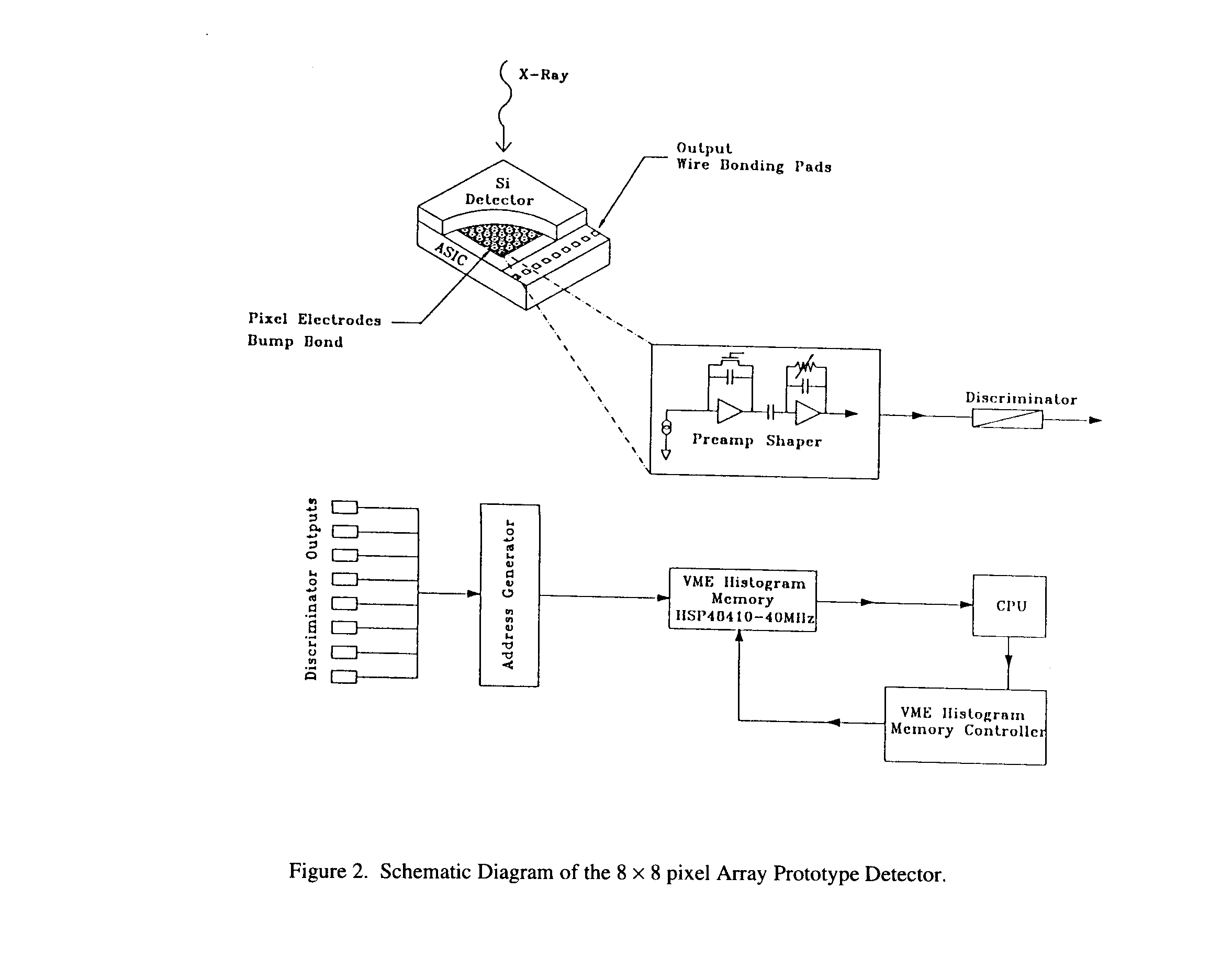 The 8 x 8 prototype detector consists of a monolithic Si diode array that is bump-bonded to the ASIC readout with gold or Indium bumps and reversed biased to +100 V (typical). The 300 mm thick detector has a pixel pitch of 150 mm and a charge collection electrode of 100 x 100 mm2. Incident X-rays through direct photon conversion are absorbed in the Si where they create electron/hole pairs. For Si, 3.6 eV is needed on average to create one (e- -h pair) (ref xx). This measured charge pulse is then amplified, shaped (for noise optimization) and fed to a differential discriminator with an adjustable threshold, where the photon hit is converted to a digital address. Fig. 2 shows the detector and preams connected to the test-processing electronics. The present measurements have been target towards characterization of the front-end analog electronics, and the characterization of Si detector pixel geometry.
