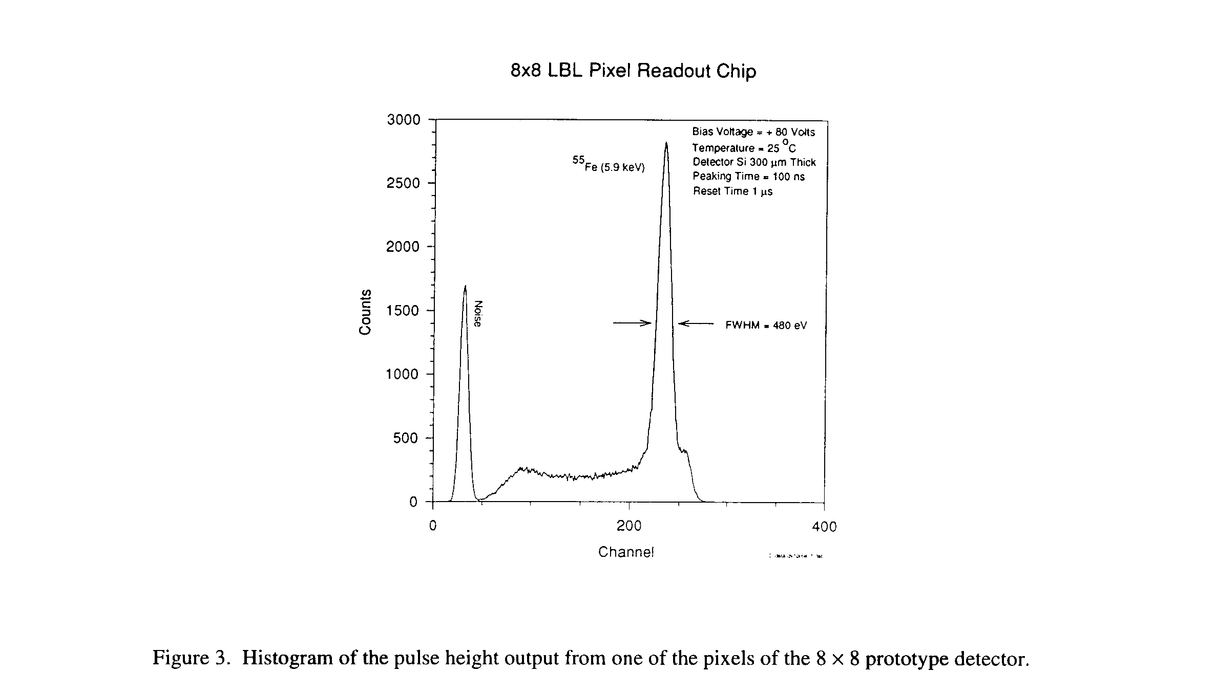 Figure 3 shows the histogram of the pulse height output from one of the pixels, when the prototype is irradiated with X-ray from an 55Fe source. The full width at half maximum (FWHM) at the 5.89 keV line is found to be 480 eV (rms -60 e-) and the 6.49 keV Kb line is visible a small hump just to the right of the 5.89 keV. The result is remarkable because the pixel array detector is working at room temperature. Until now, to achieve this kind of precision, a single detector must be cooled down to -30 C. The small plateau at lower energies to the left of the 5.89 keV peak is the result of charge trapping due to an oxide layer on the surface of the detector between the electrodes. Future detectors will be optimized to reduce this trapping effect.