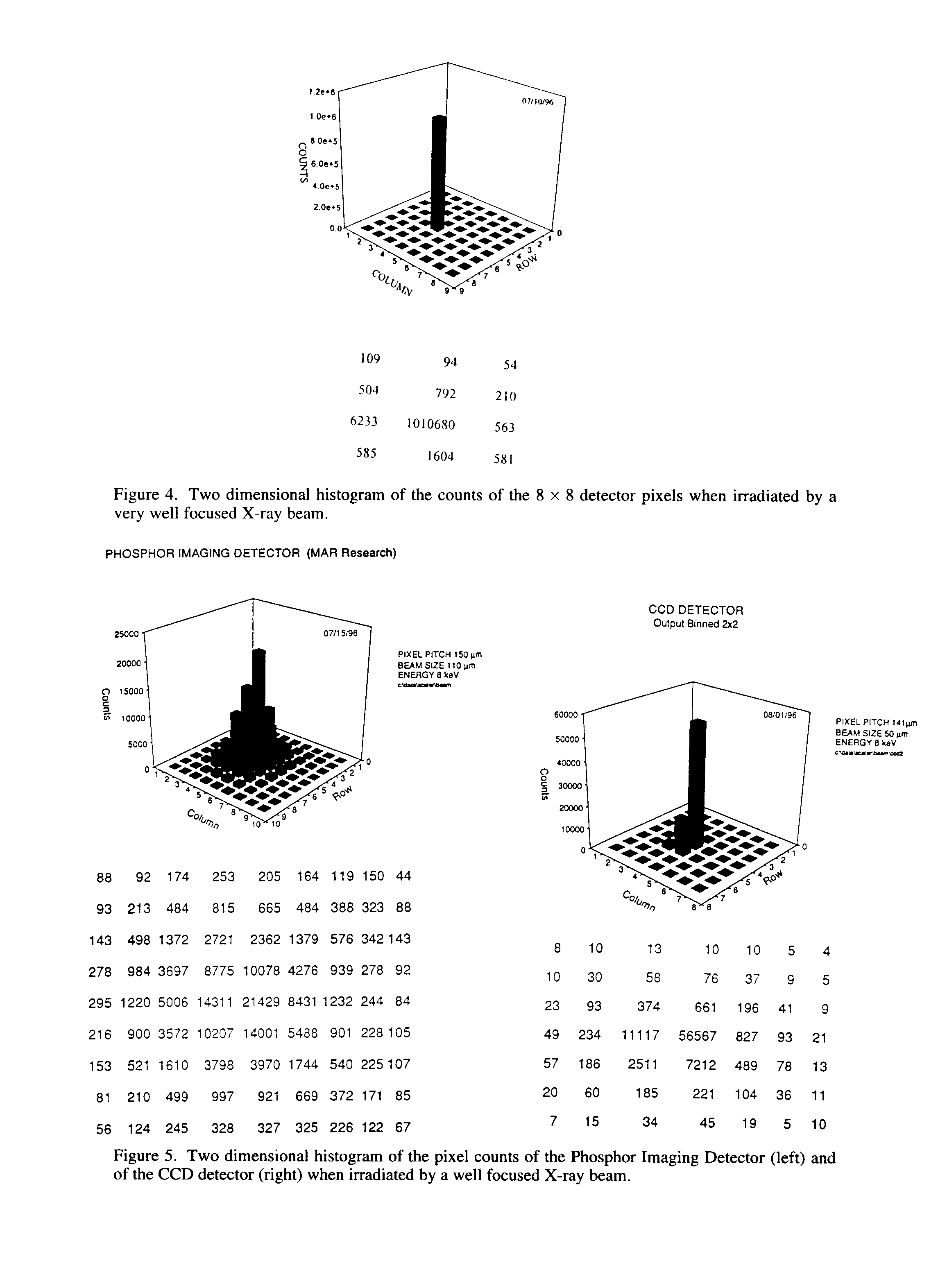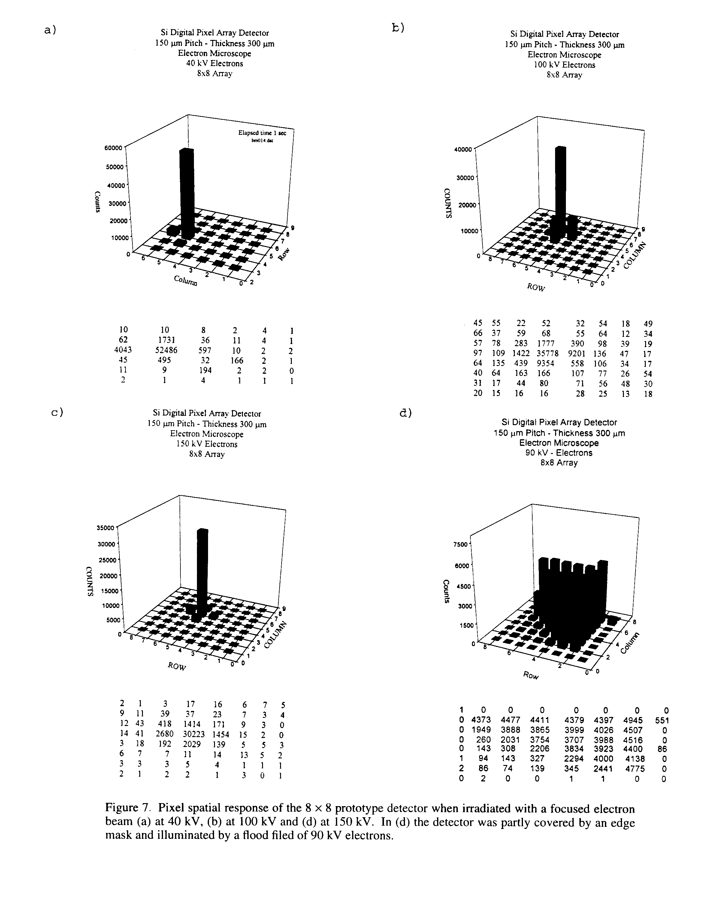 In order to test the feasibility of using this type of detection for electron microscopy, the prototype detector was put in a JEOL-2000 EX electron microscope in the voltage range of 20-200 kV. The detector was mounted on a special flange at the bottom of the electron microscope. Figures 7a-c show the pixel spatial response of the 2D detector when illuminated with a focused electron beam at 40 kV, 100 kV and 150 kV. The counts are still very well localized especially with beam energy below 100 kV; above 100 kV the range of some incident electrons in silicon could be above the pitch of the pixel (150 micron).