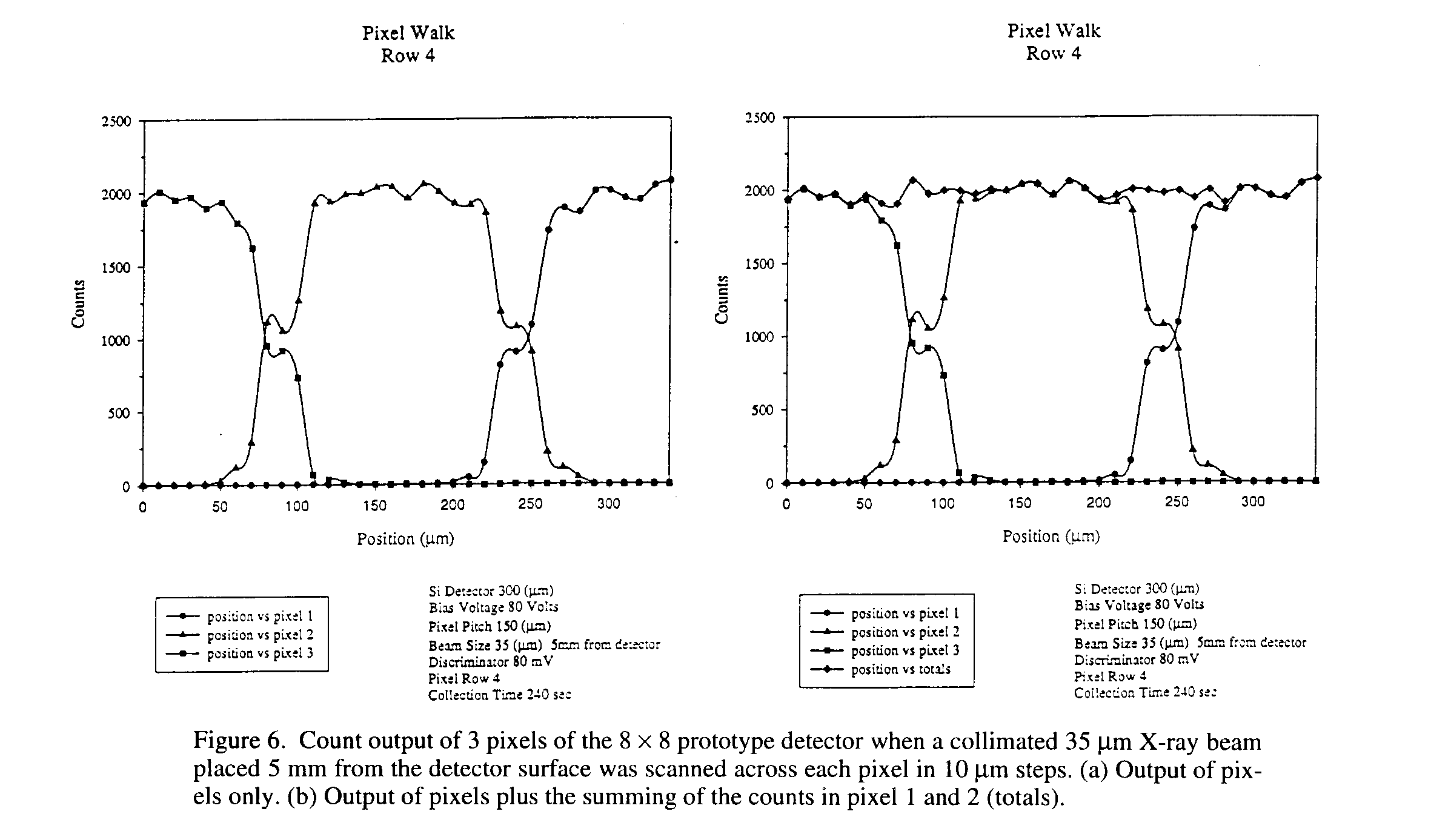 A study of the interstitial spacing was conducted to understand the point-spread function and charge sharing that may occur at the gap between neighboring pixels. Figure 6 shows a pixel walk plot of three pixels side by side. To make the measurement, a collimated 35 mm X-ray beam, placed 5 mm from the detector surface was scanned across each pixel in 10 mm steps. Counts from each pixel were then recorded. From the graph it can be seen that the raise (or fall) of the counting rate on the edge of a pixel could be simply due to the shape of the X-ray beam which should have a FWHM of about 35 mm. More importantly is that the plot shows the gaps between pixels behave in a similar manner and are quite symmetric. In addition, Plot A in Fig. 6 clearly shows that the pixel detector does not have an "dead" space. The charge is efficiently collected in all areas of the detector including the area between the charge collection electrodes (i.e. the 50 mm spacing). From plot B in Figure 6, the summing of the counts in pixels 1, 2 and 3 (totals) show little or no "double counts" at the pixel gap. From this, the point-spread function is observed to be near zero with the discriminator setting of 80 mV and a 10 mm step size. This is in agreement with typical diffusion length for this detector geometry which is found to be about 5 mm.